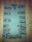 Sometimes it’s hard to tell who speaks and who gets drowned out. To get to the bottom of this, one of our team began mapping who spoke during the retro, almost as a doodle. It’s a simple idea which has been evolved by other members of the team as they had a go at it. The latest incarnation of the heat map shows who is interacting with who. The secret sauce here is empowerment. This mapping process started because Dan felt empowered to just do it, and each subsequent team member who evolved the map felt empowered to adapt and improve it.
