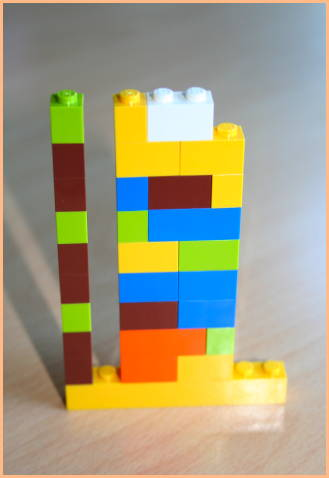 Right there, that’s Michael’s week. Each row of bricks represents an hour, and each tower is a day. As he goes through his day, he uses the coloured blocks to represent the project he’s working on (the box of lego came with 8 colours, and he figures thats enough to cover his projects). As he goes hour by hour, he adds the coloured bricks to the row for that hour. And builds up his day. The sizes of the bricks allow Michael to track in 15 minute increments, which should be enough.