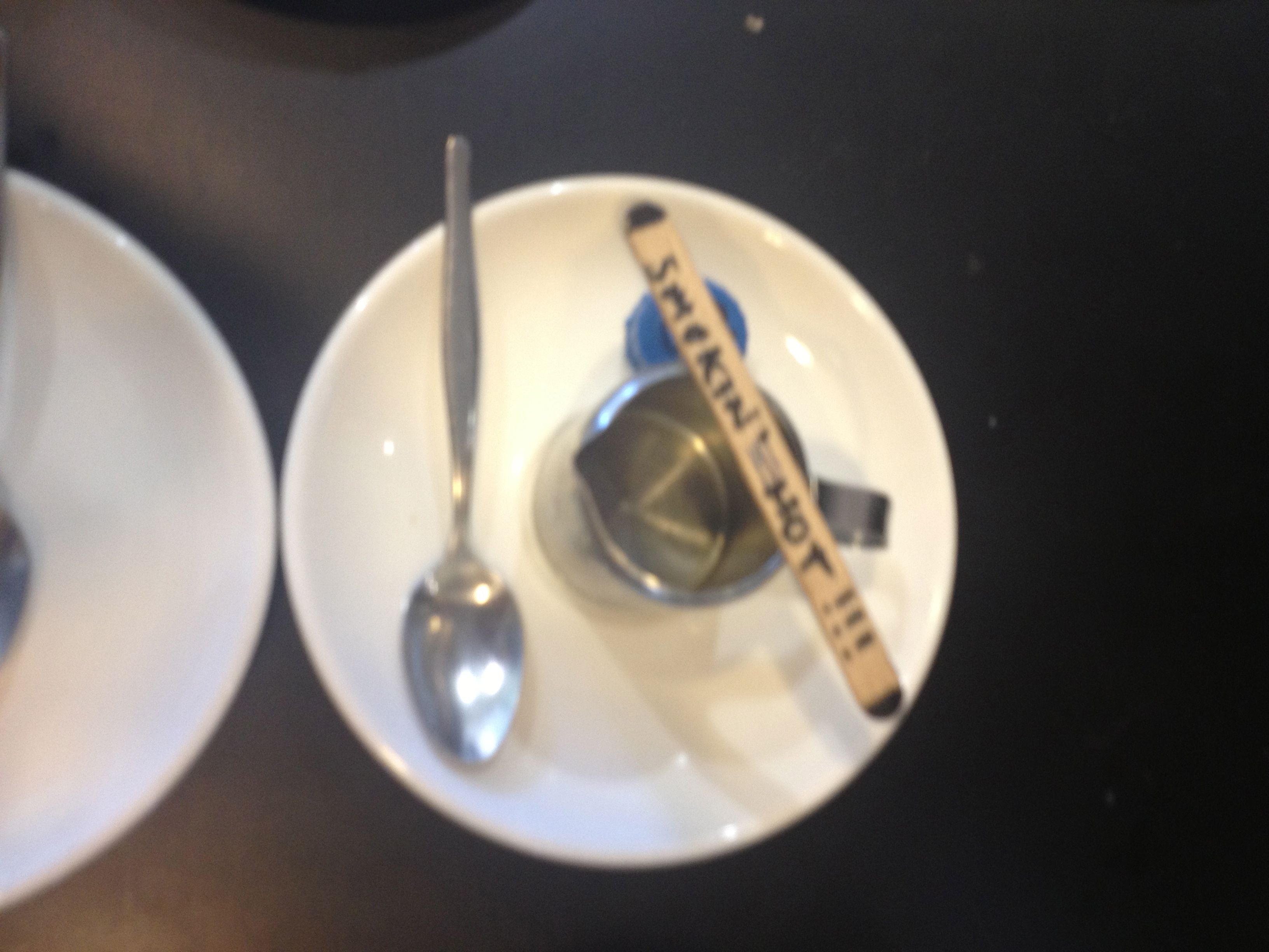 The first cup in the queue is a flat white (milk jug) for the outside right table (see bottle cap), with one sugar (1 spoon). And it’s followed up by a cafe latte with two sugars for the same table.